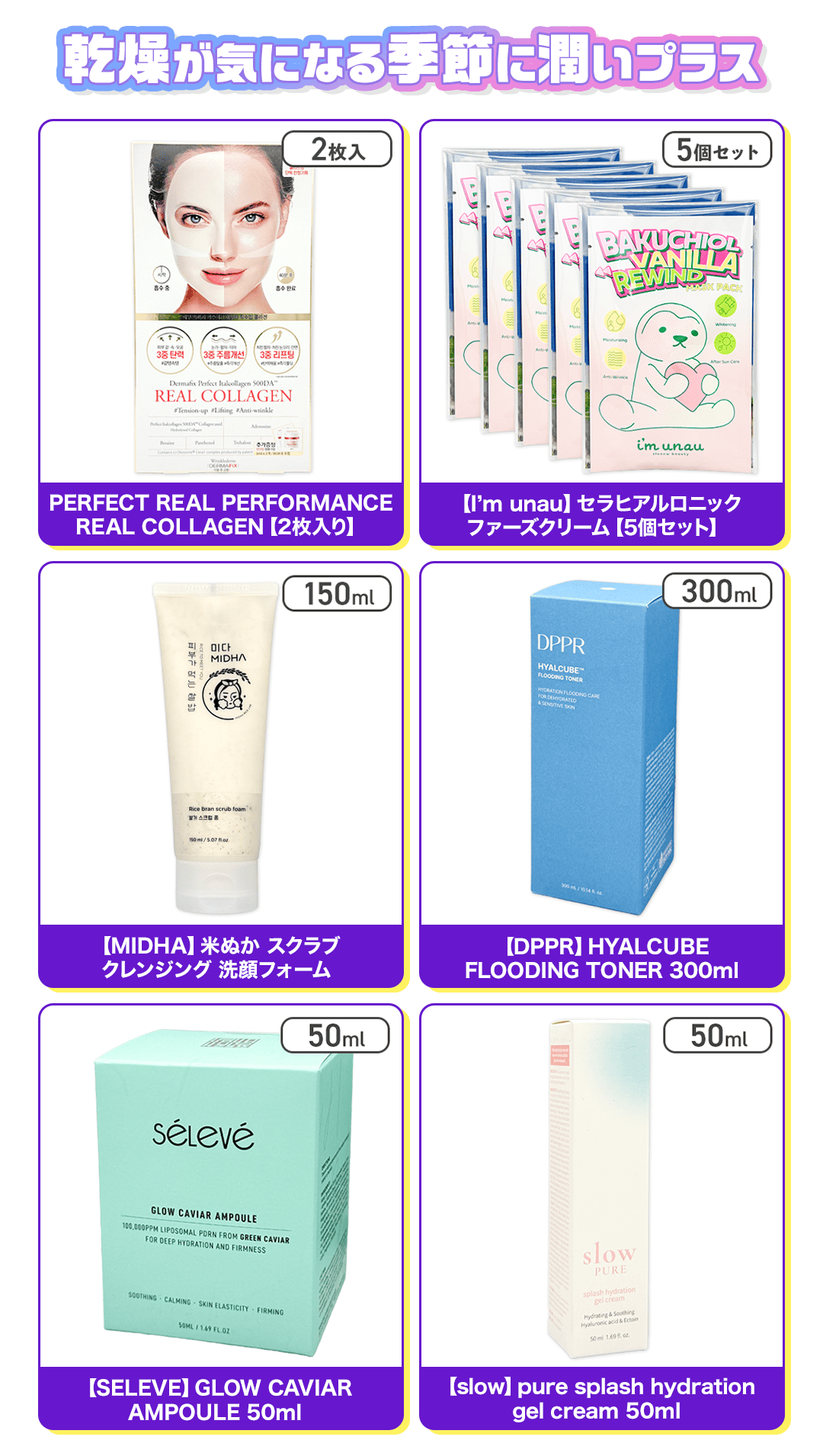 キャビアケア、ヒアルロン酸、コラーゲン、CICAなど、韓国美容で人気の成分を配合したアイテムをラインナップしています。