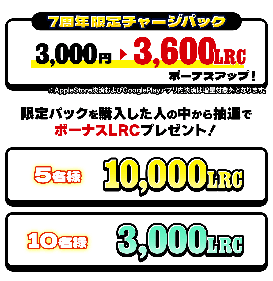 さらに期間中上記プランでチャージいただいた方の中から抽選で最大10,000LRCをプレゼント!