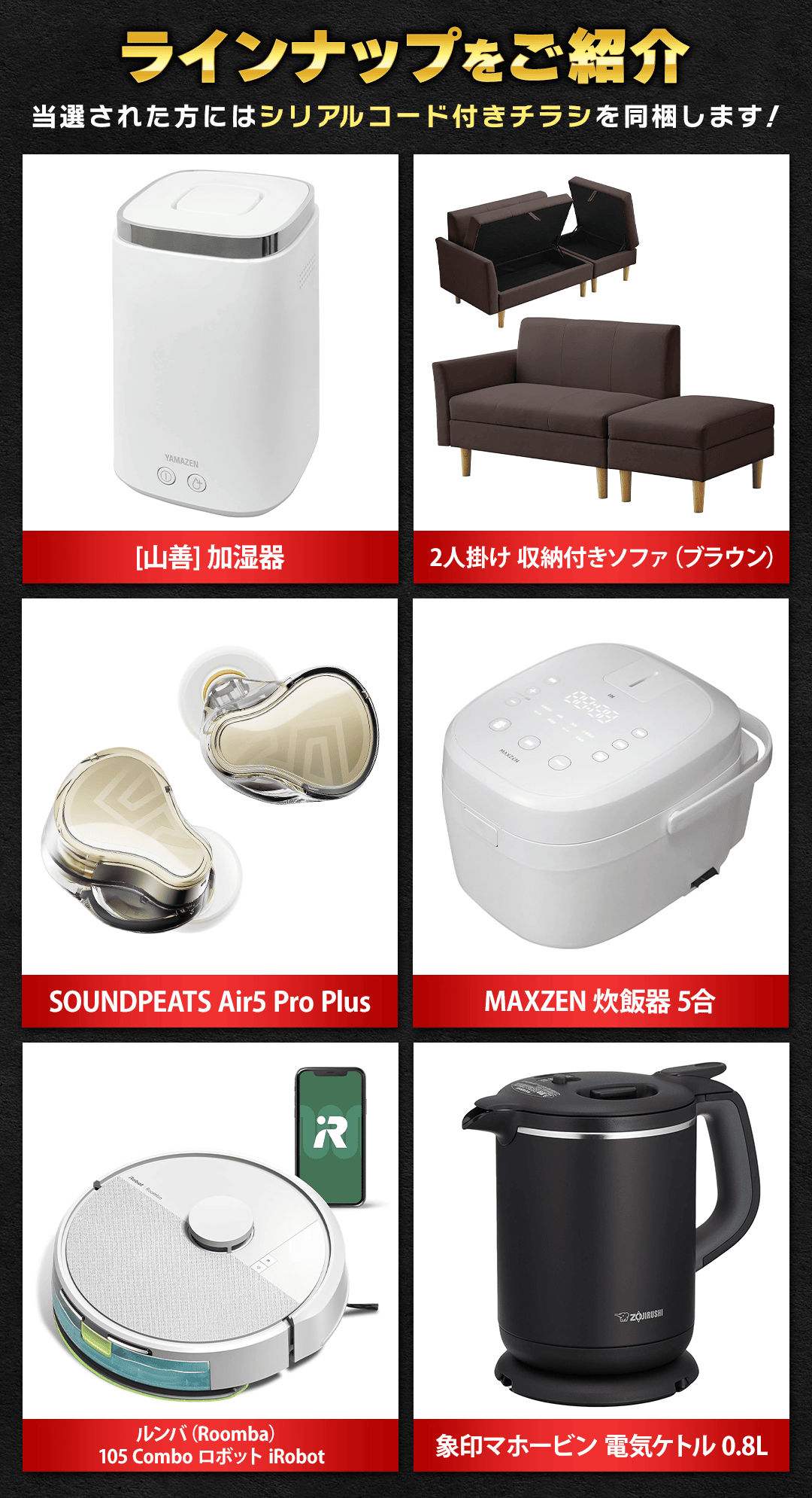 ダンボールの中に シリアルコード付きチラシ が入っていたら当選です。