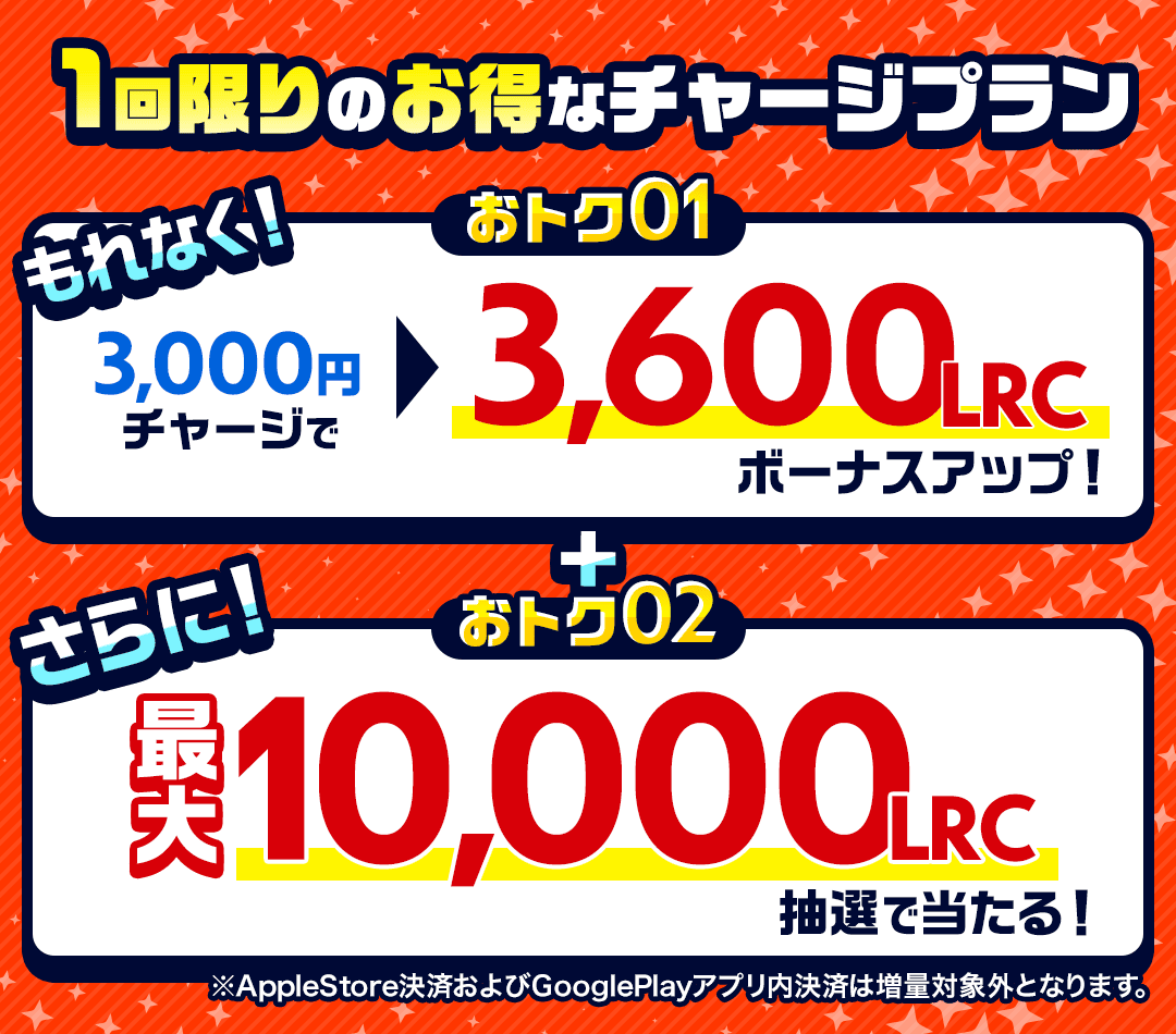 お1人様1回限り3,000円で3,600LRCを獲得できる特別なチャージメニューが登場!