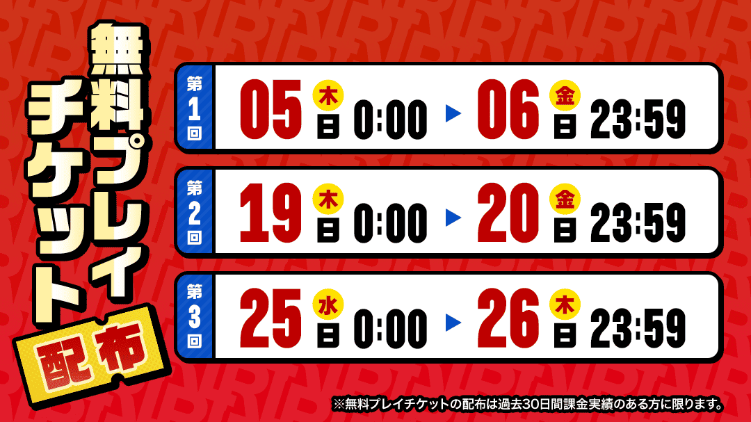 - それぞれの配布期間に取得できる本イベントの無料プレイチケットの枚数は最大1枚です。