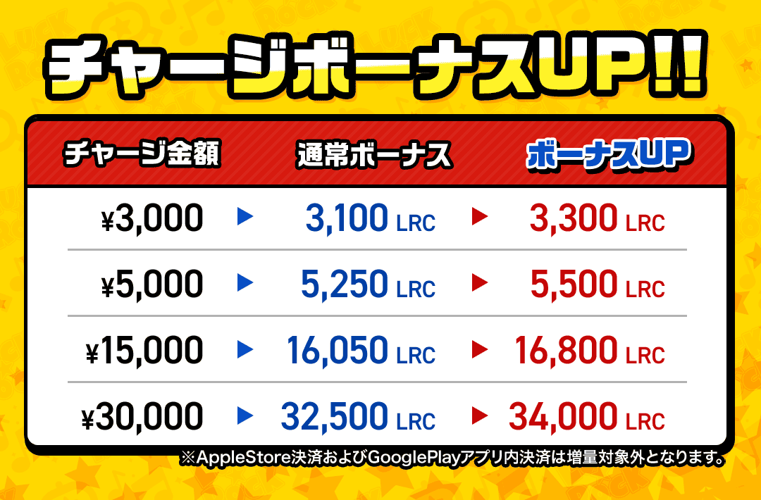 ・AppleStore決済およびGooglePlayアプリ内決済は増量対象外となります。