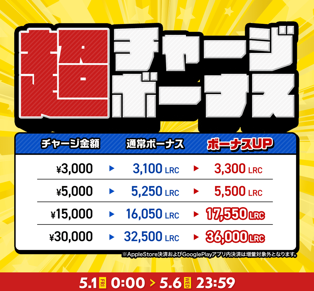 ・AppStore決済およびGooglePlayアプリ内決済は増量対象外となります。
